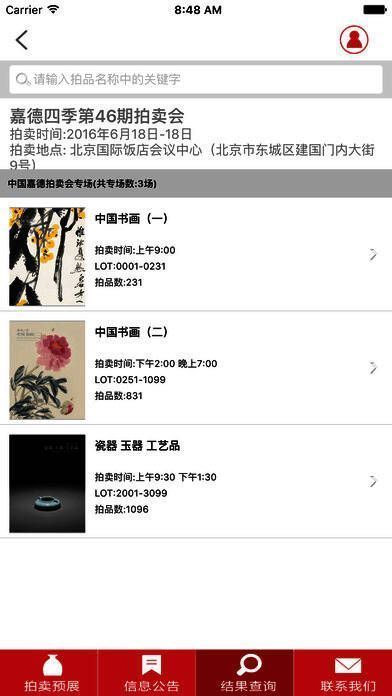 3、结果查询:展示嘉德曾经拍卖过的拍品信息;