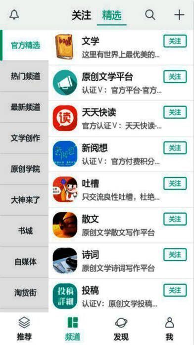 2、文学创作相关频道推荐;