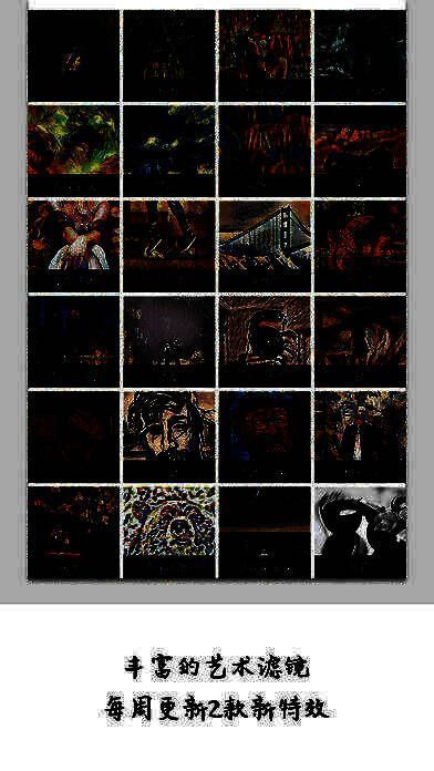 1、丰富的艺术滤镜:梵高、浮世绘、达达主义…每周更新2款新特效;