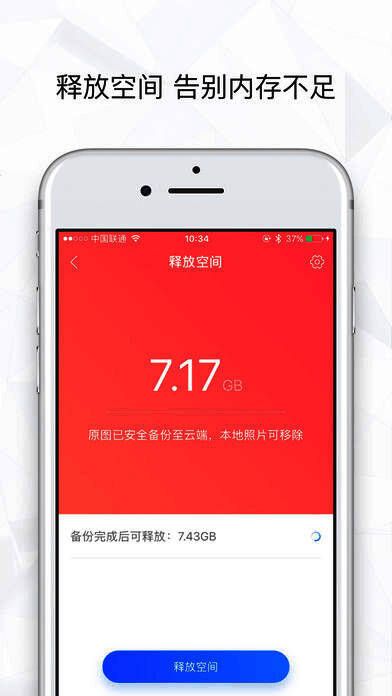 2、释放空间,告别空间不足:使用释放空间功能,将自动备份照片并移除手机中已备份的照片,再也不用担心手机空间不足了;