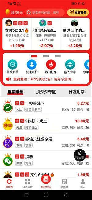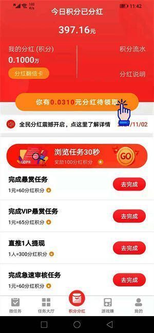 除了传统的悬赏任务,红赏吧还融合了多种趣味玩法,如水果赚钱、游戏打榜、多游试玩、点赚试玩等,甚至还有冲榜大奖活动,每月上榜即可赢取现金奖励。此外,平台还推出了全民分红机制,完成任务即可积累分红积分,参与每日分红,实现被动收入。