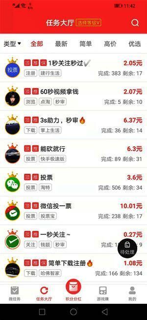 红赏吧app为用户提供了海量的任务内容,涵盖下载、注册、实名认证、关注公众号、浏览网页、投票等多种形式,满足不同用户的操作习惯。同时,平台支持按照“最新”、“简单”、“高价”等筛选方式,让用户更轻松地找到适合自己的任务。