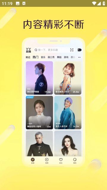 通过“附近主播”功能,用户可以发现身边的主播并进行连麦互动。这种基于地理位置的交友方式,让用户更容易找到兴趣相投的朋友,扩大社交圈层。同时,YY语音内设有丰富多样的娱乐房间,涵盖游戏、音乐、脱口秀等类型,满足不同用户的兴趣需求。