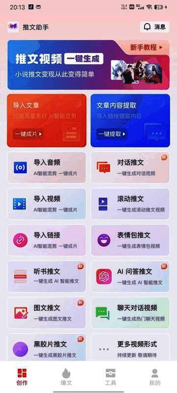 在如今内容创作竞争激烈的环境下,一款高效、实用的辅助工具对于短视频和小说创作者来说尤为重要。推文助手苹果版正是这样一款专注于提升创作效率与作品曝光度的专业应用。它不仅提供个性化推荐、关键词追踪、封面生成等核心功能,还整合了丰富的视频教程资源,为创作者打造了一站式的内容创作服务平台。