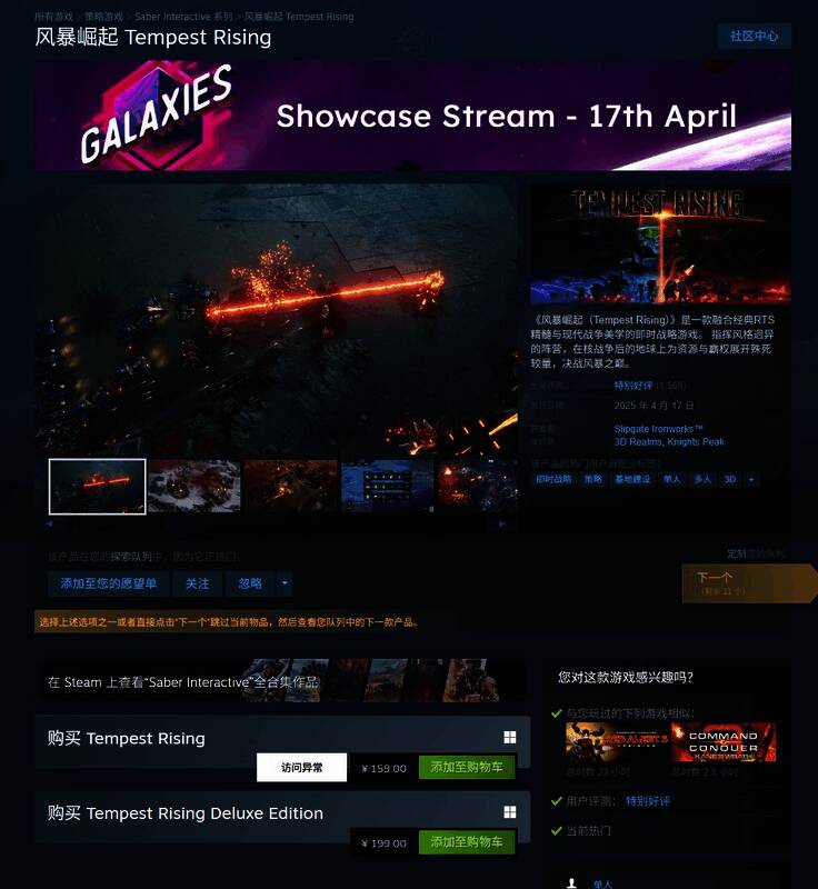 《幽灵行者》、《GRAVEN》开发商Slipgate Ironworks打造的RTS游戏《风暴崛起》于本月17日开启了“抢先体验”,Steam国区159元,豪华版199元。