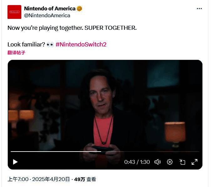 而在北美地区,任天堂北美发布了由“蚁人”男星保罗·路德主演的电视广告: