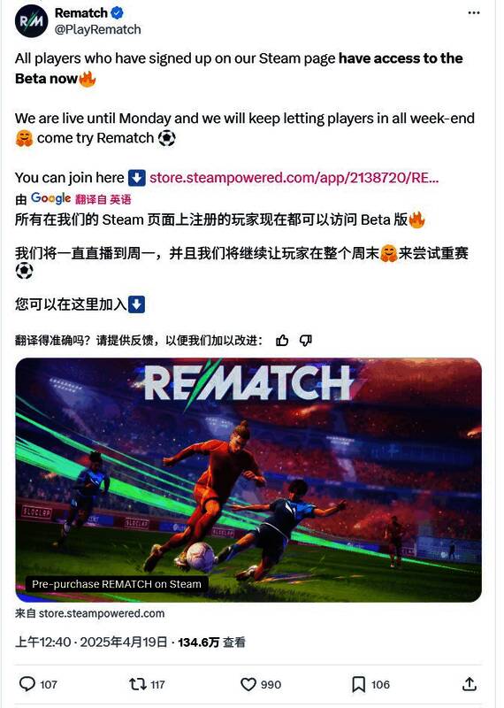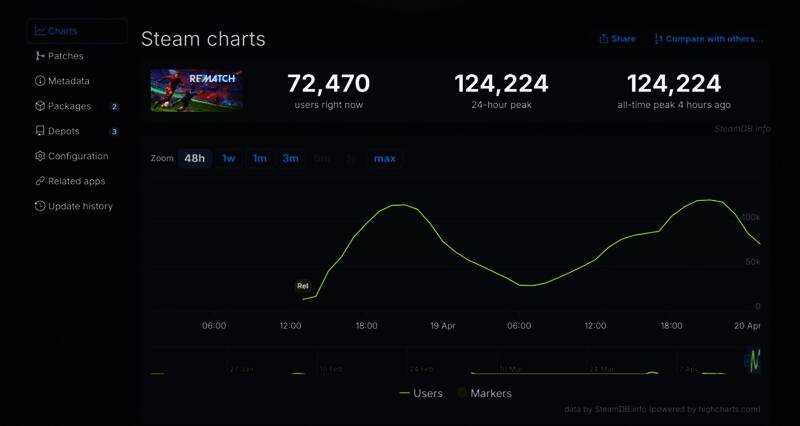 《Rematch》BETA公测峰值超过12万,当前在线7.2万
