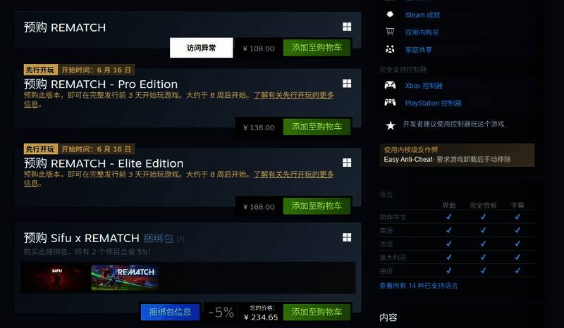 本周早些时候,Sloclap确认《Rematch》将于6月19日发售,登陆PC、Xbox Series X|S和PS5,国区标准版108元,专业版138元,精英版168元。预购后两个版本的玩家可以提前3天进入游戏。此外,该游戏还将加入Xbox Game Pass。