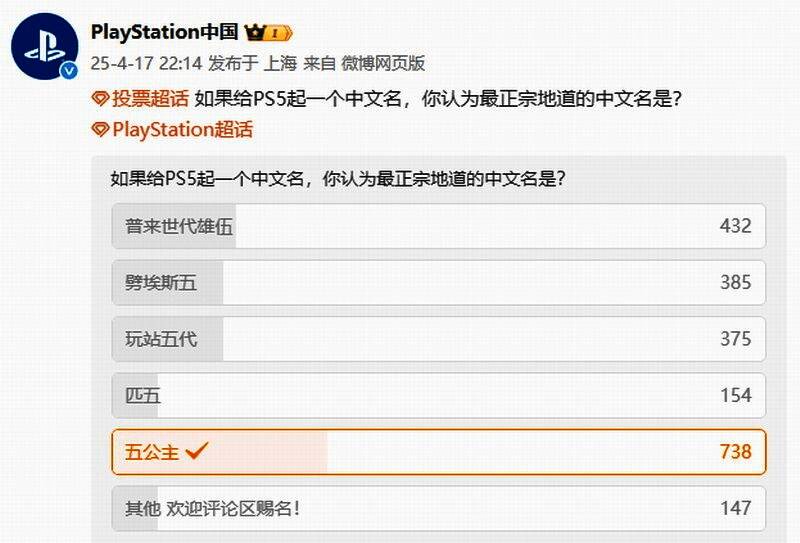 近日PlayStation中国在微博上发文,向玩家们发起投票:“如果给PS5起一个中文名,你认为最正宗地道的中文名是?”
