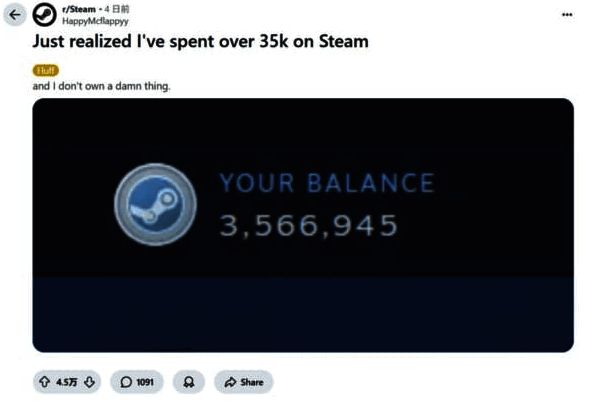 ·HappyMcflappyy日前在Reddit上发帖,惊叹自己不知不觉竟然在Steam上花费了3.5万美元,引发玩家们共鸣,而且顺便替他回复了下一句,“可是没有得到任何实物”。