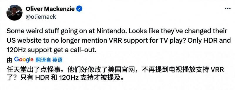 数毛社Digital Foundry记者Oliver Mackenzie指出,任天堂部分地区网站上已删除了关于VRR的提及。截至撰稿时,加拿大、美国和日本官网上都已删除了关于VRR的提及。目前只剩下欧洲官网还挂着,但任天堂可能正在将其从所有版本的网站上删除,并且尚未更新其欧洲官网。