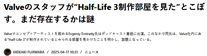 ·Evgeniy Evstratiy的身份已经被领英所证实,这样看来其发言可信度很高,这个神秘的所谓《半条命3》开发房间一面究竟是怎样一副情形目前不得而知,虽然官方没有透露任何消息,但是这个房间的存在起码证实了V社是有过《半条命3》开发念想的。