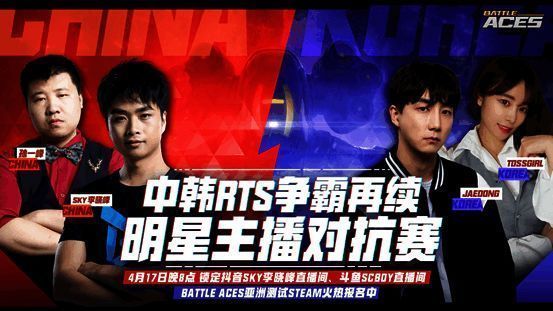 同日晚上20:00,抖音SKY和斗鱼SCBOY直播间将全程实时直播《Battle Aces》亚洲级BO5赛制的2V2对决。届时,人皇SKY将携手孙一峰对战韩国“虫王”李帝东和TOSSGIRL。