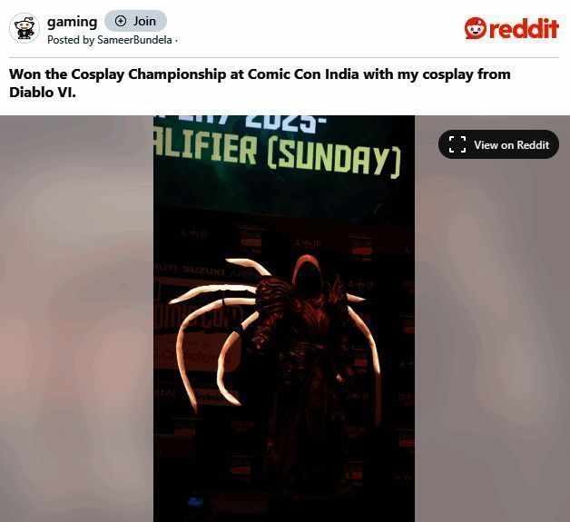 4月12日~13日,印度孟买举行了大型漫展Munbai Comic Con 2025,自然少不了各路COSER英豪现场竞技,其中SameerBundela凭借《暗黑4》的精致大天使扮相斩获冠军,没想到自己发帖展示时却发成了《暗黑6》,引发玩家爆笑热议。