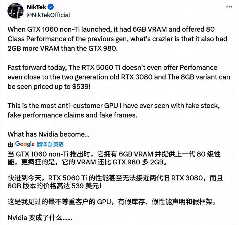 推主讽刺RTX 5060Ti(16GB版)甚至连隔了两代的RTX 3080都不如,当年的1060可是媲美上世代旗舰GTX 980