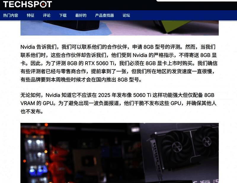 然而,英伟达却选择对评测者隐藏8GB型号。RTX 5060没有评测禁令,虽然5060 Ti的评测昨晚上线,但8GB显卡的评测几乎不会出现。英伟达无法给出令人满意甚至是合乎逻辑的解释,评测者不会收到8GB型号。尽管英伟达否认试图压制8GB型号的评测,但我们知道他们确实在这么做。“