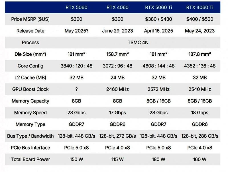 RTX 5060Ti和RTX 4060、RTX 4060Ti的定价、规格对比:
