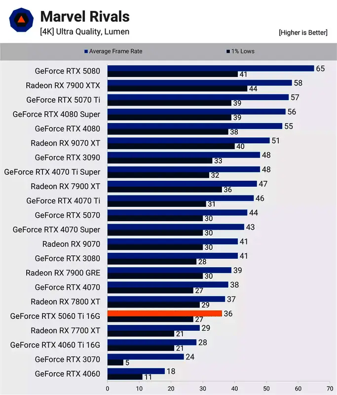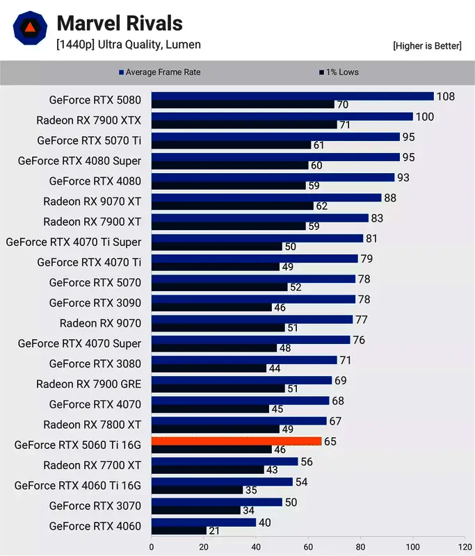 从 1440p 分辨率的《漫威争锋》开始,5060 Ti 的速度明显快于 4060 Ti。我们预计其性能将提升 20%,与7800 XT和RTX 4070相当。