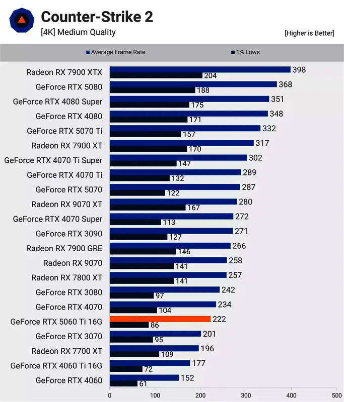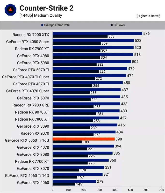 在《反恐精英2》中,5060 Ti 在 1440p 分辨率下的性能提升相当令人印象深刻,提升了 24%,平均每秒 398 帧,这使得 5060 Ti 大致与 RTX 4070 和RX 9070相当。