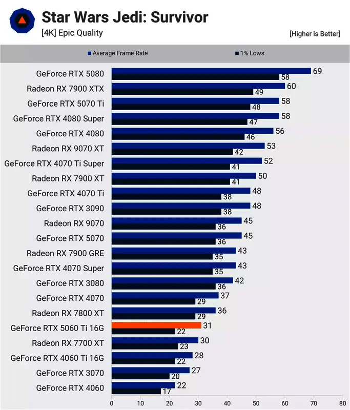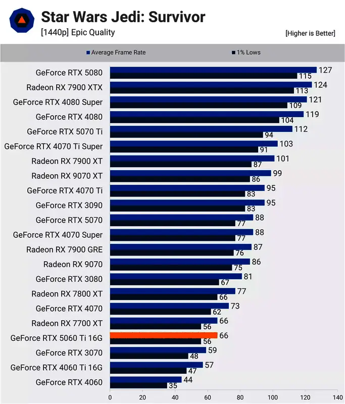 在《星球大战绝地:幸存者》中,1440p下,5060 Ti 能够以 66 fps 匹敌7700 XT,比 4060 Ti 快 16%。