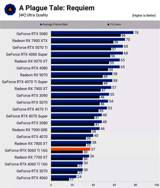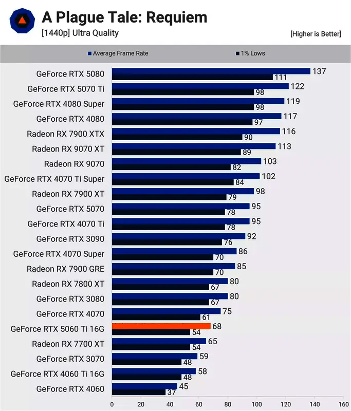 在 1440p 的《瘟疫传说:安魂曲》中,5060 Ti 比 4060 Ti 快 17%,仅比 7700 XT 快 6%。