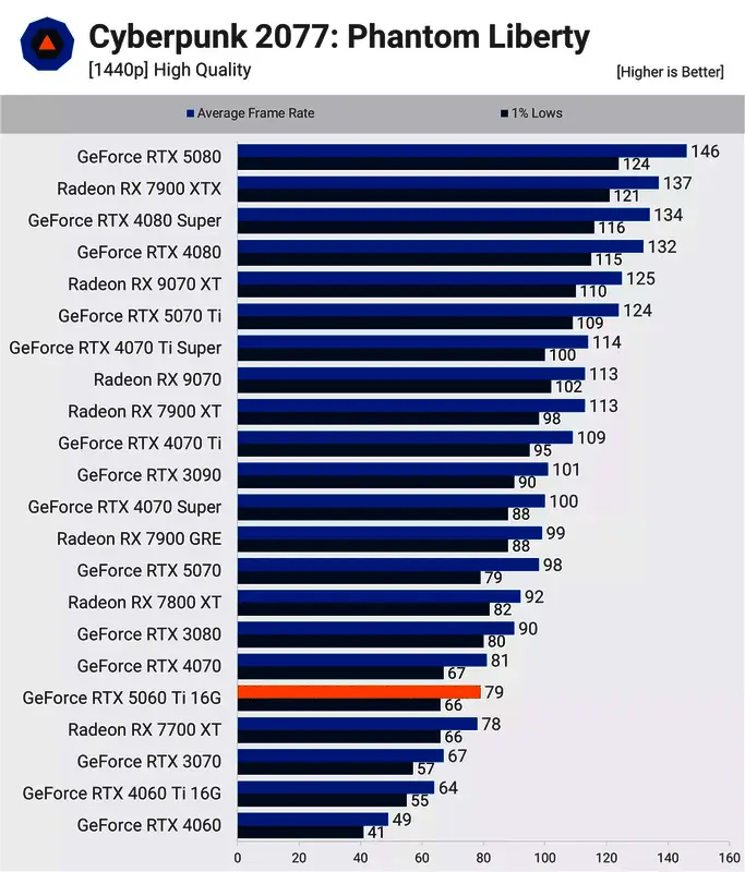 《赛博朋克2077》的测试结果与我们目前看到的一致。在 1440p 分辨率下,5060 Ti 的帧率与 RTX 4070 和 7700 XT 相当,均为 79 fps。