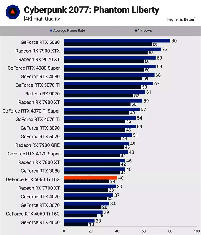 在 4K 分辨率下,5060 Ti的性能不足以进行原生渲染,尽管升级后性能会显著提升。即便如此,它仍然提供了与 7700 XT 相当的性能,比 4060 Ti 提升了 23%。