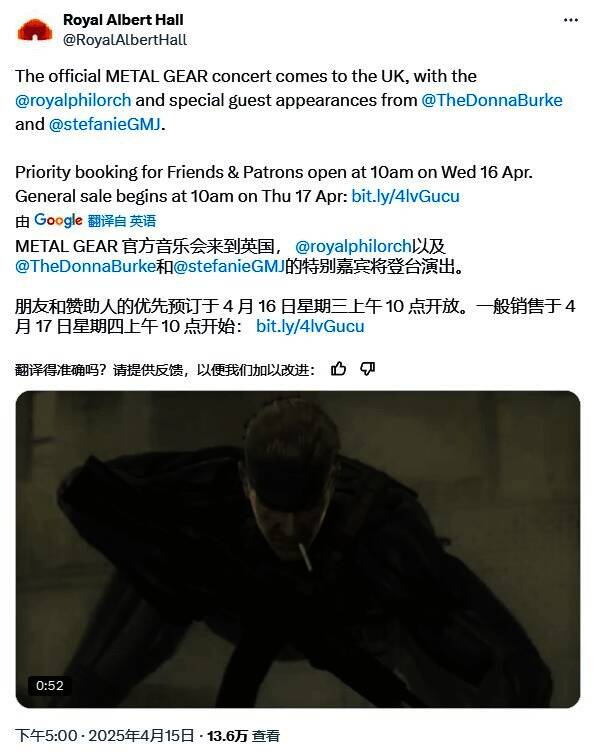 经典游戏系列《合金装备》主题交响音乐会“Metal Gear In Concert”将于今年11月1日首度在英国伦敦皇家阿尔伯特音乐厅盛大举行。