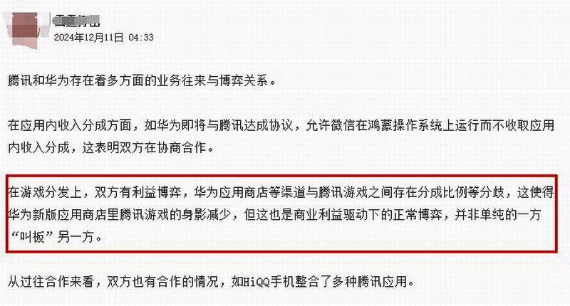 此外据网传截图,在2024年12月上旬,华为应用商店与腾讯游戏之间存在分成比例等分歧,双方有利益博弈,这使得华为新版应用商店里腾讯游戏的身影减少。