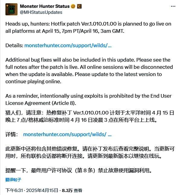遗憾的是玩家还没爽够,卡普空的大手就来了,官方紧急在官网和X平台发布热修通知,修复补丁Ver.1.010.01.00计划于北京时间2025年4月16日10:00在所有平台上上线。详细修复内容如下:
