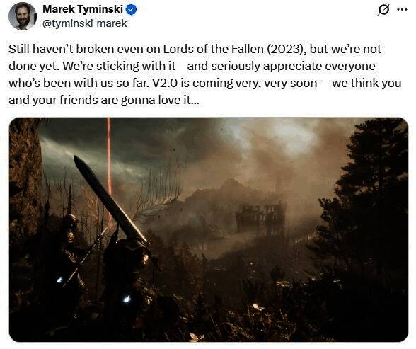 近日CI Games总裁Marek Tymiński发推文称:“《堕落之主》至今仍未回本,但我们的计划远未完成,我们会坚持下去。衷心感谢所有一路陪伴我们的玩家。2.0版重大更新即将上线——相信你和你的朋友们一定会爱上它……”