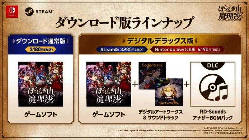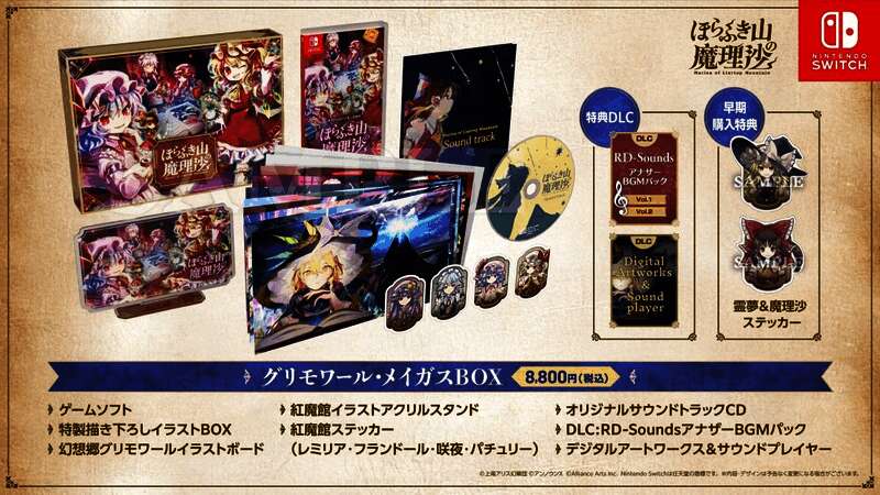此外,配合游戏发售,还会同步推出“实体限定版Grimoire Magus BOX”,收录可将游戏内BGM更换为RD-Sounds代表乐曲的DLC“RD-Sounds另类BGM包”、全新绘制的“插画BOX”、丰富收藏本作精美视觉美术以展现其故事世界的“幻想乡魔法书插画集”、收录游戏本篇BGM的“原声带CD”、以红魔馆角色插画制作的“红魔馆亚克力立牌”、“红魔馆贴纸(蕾米莉亚、芙兰朵露、咲夜、帕秋莉)”,以及可聆听本篇及DLC共50首以上BGM并同时鑑赏数字插画集的“数字美术集&音乐播放器”,并可拥有与一般版共通的实体版首批购买特典“灵梦&魔理沙贴纸”。另外,内含DLC“RD-Sounds另类BGM包”与“数字美术集&配乐”的“数字豪华版”也将同步发售。