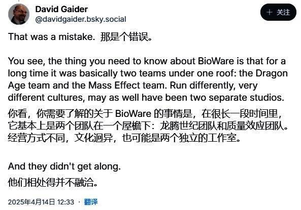 在Bluesky的爆料长文中,Gaider回忆道:“当时的BioWare本质上是同个屋檐下的两个团队,《龙腾世纪》组与《质量效应》组,运作模式迥异,文化氛围截然不同,简直像两家独立工作室——而且他们彼此看不顺眼。”这种对立持续多年,管理层试图通过人员轮岗缓解矛盾,但当他加入《圣歌》项目(原《质量效应》团队主导)时,才意识到问题的严重性:“那个团队根本不想让我加入,毫不掩饰。”