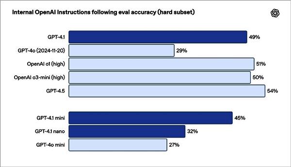 OpenAI基准测试显示,GPT-4.1系列在编码、指令遵循、长文本理解方面的得分均超过GPT-4o和GPT-4o mini。