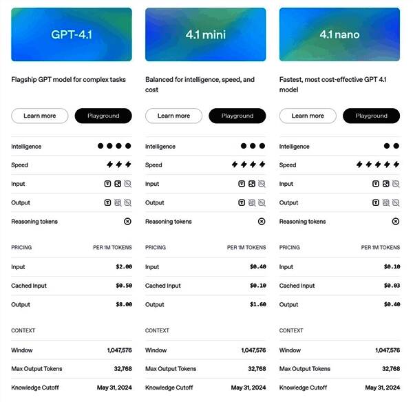 据悉,GPT-4.1每100万tokens输入费用为2美元,每100万tokens输出费用为8美元,对于中等规模查询,GPT-4.1的价格比GPT-4o低26%。