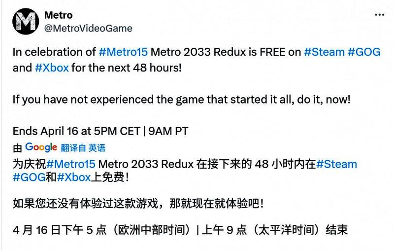 为庆祝《地铁》系列15周年,4A Games宣布第一人称射击游戏《地铁2033:复刻版(Metro 2033 Redux)》48小时免费领取,玩家可在Steam、GOG、Xbox平台领取,此次活动截至4月16日晚上11:00。
