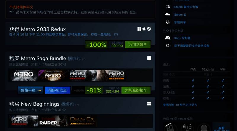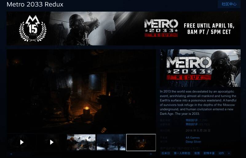 《地铁2033:复刻版》2014年8月28日发售,Steam无中文。除了免费活动外,《地铁》系列游戏也在多个平台展开促销。