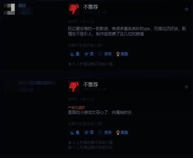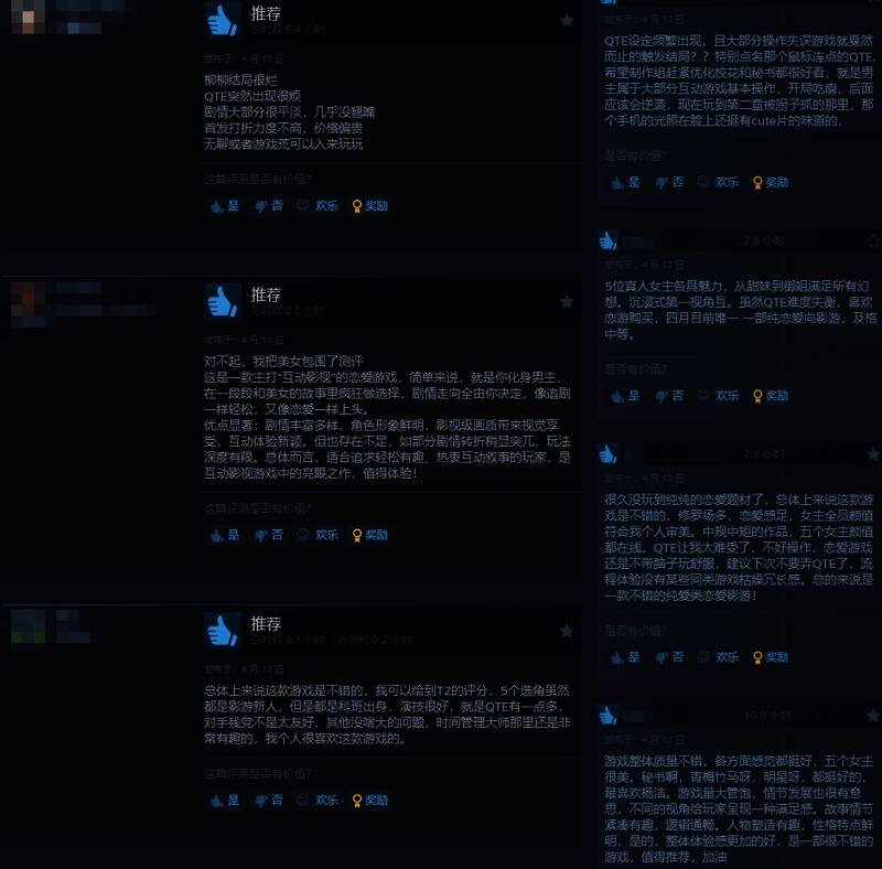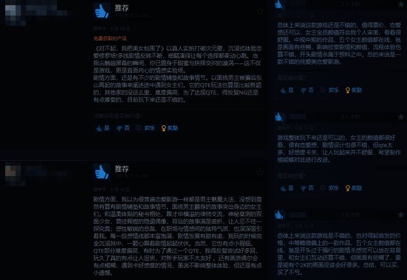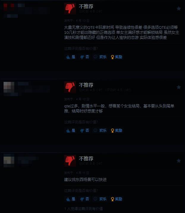 给予差评的玩家认为,游戏中QTE设定频繁出现,不好操作、画质也比较糊。里面的小游戏太恶心了,纯属拖时长。想看某个女生结局,基本要从头到尾单推,结局时好感度才够。
