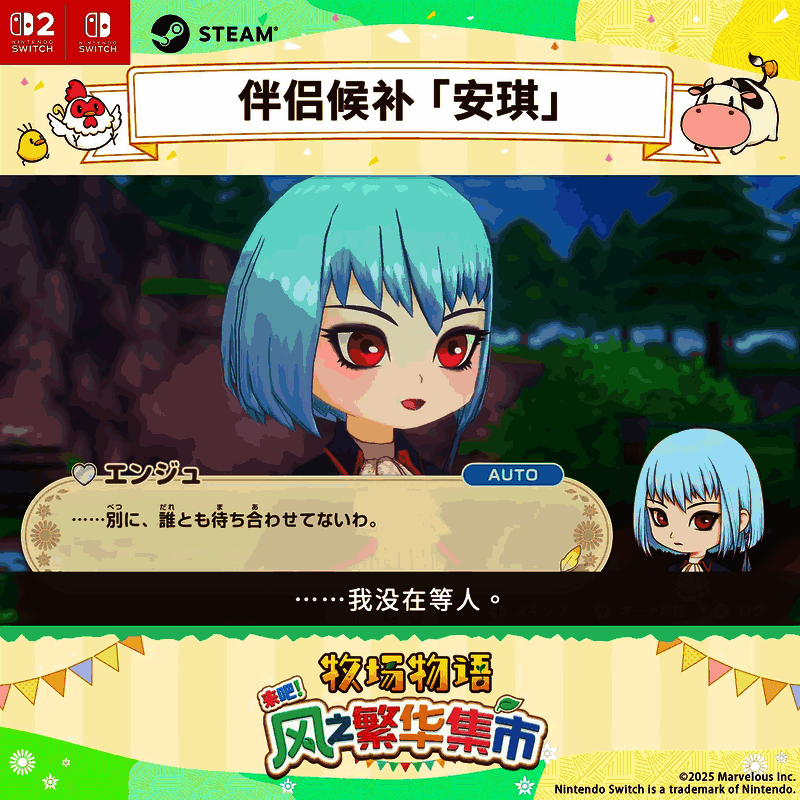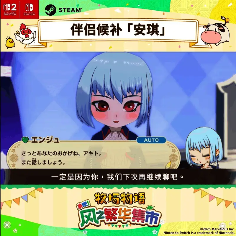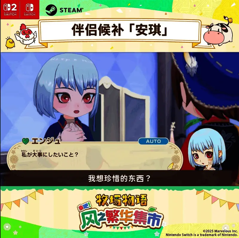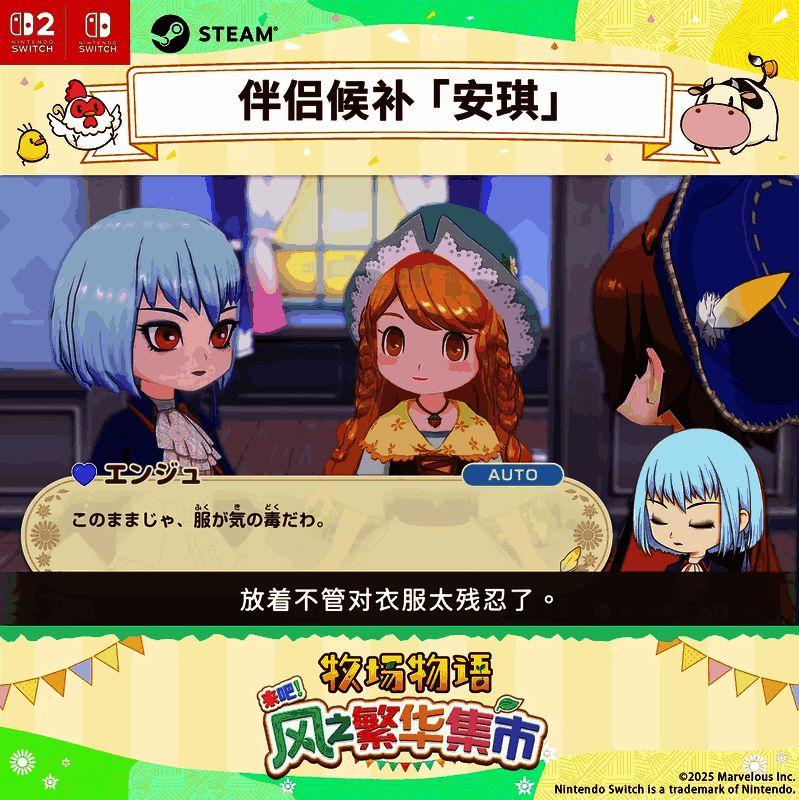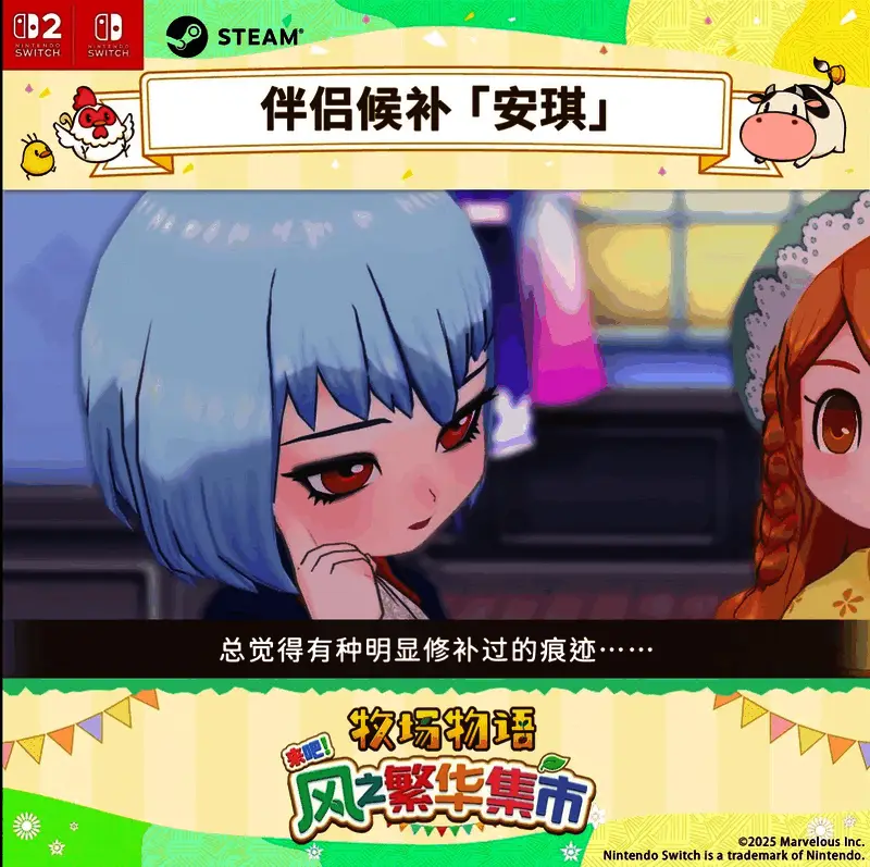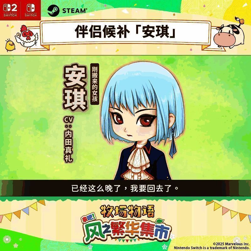 4月8日,开发商Marvelous发布了《牧场物语来吧!风之繁华集市》的伴侣介绍影片:安琪(cv:内田真礼),展示了该角色的部分主线剧情与恋爱剧情画面。《牧场物语 来吧!风之繁华集市》预计将于8月28日发售,登陆Switch、Switch 2和Steam,支持中文。
