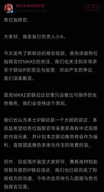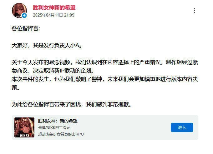 关于今天发布的悬念视频,我们认识到在内容选择上的严重错误,制作组经过紧急商议,决定取消新IP联动的企划。本次事件的发生,也为我们敲响了警钟,未来我们会更加慎重地进行版本内容决策。