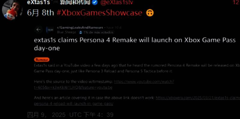 同时,他还继续爆料表示《女神异闻录4 重制版》、《忍者龙剑传4》和《我的世界:地下城2》也可能出现在其中,这位爆料人对于P系列的爆料还是挺精准的,不管是《女神异闻录3:Reload》还是《女神异闻录5:战略版》的发售都无一失手。
