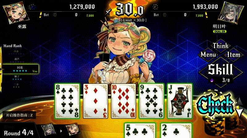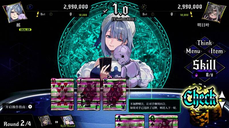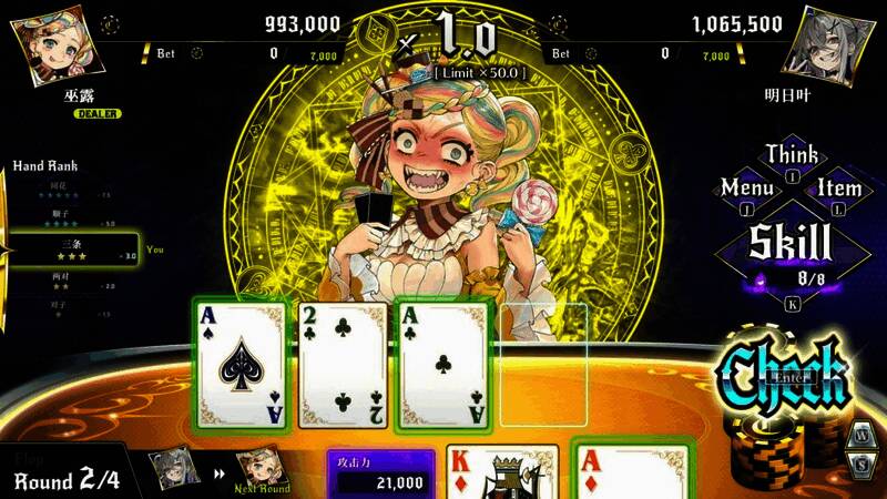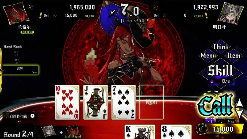 本作的扑克对决是类似于德州扑克的,1对1混战类扑克卡牌游戏。 让对手的筹码归零即为胜利。