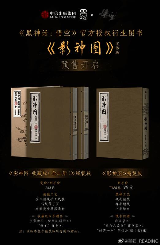 今日(4月10日)墨狸工作室官方在微博宣布,《黑神话:悟空》影神图实体版已正式发售,本次影神图实体版分为精装版与收藏版。精装版不限时不限量,收藏版(全二册)》线装版:4月10日12:00-5月20日23:59 指定官方渠道 限时订购。