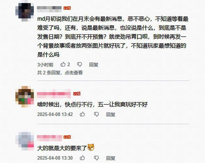 评论区有许多玩家表示很期待,有人猜测是4月25日公布消息,因为崇祯就是在那天自缢的。还有人称官方宣发吊胃口,赶紧公布发售时间。有玩家说:“预购什么时候开始?能不能五一让我爽玩!”