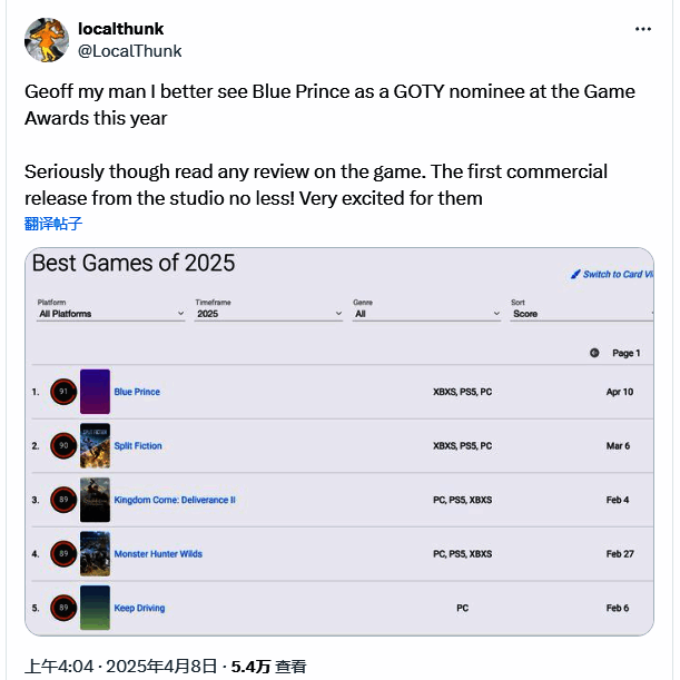 LocalThunk在推特上发文称,"Geoff(TGA创始人),今年的TGA颁奖礼上我要是看不到《蓝途王子》入围年度游戏提名,这事儿可没完!说真的,随便翻翻这游戏的评测就知道有多棒。这甚至还是他们工作室的首部作品!真为他们感到兴奋。"