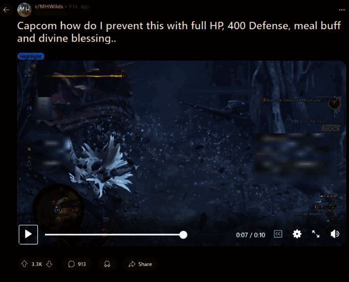 卡普空大作《怪物猎人:荒野》刚刚发售不久,相信有些玩家还是没有掌握部分窍门,日前一位玩家暴怒发帖质问卡普空,防御力400,HP满格、吃了料理BUFF,甚至还有精灵的加护,居然还是被泡狐龙一击必杀,引发热议。