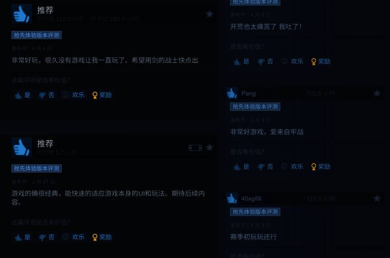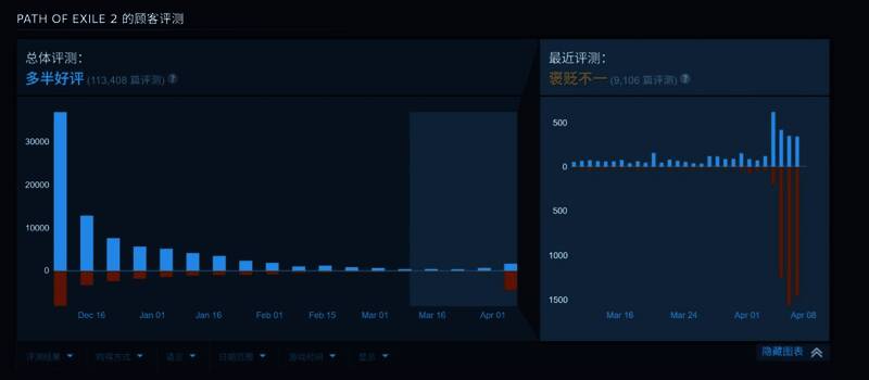 据该作的Steam页面“最近评测”柱状图反应,从4月4日新赛季上线开始就不断涌入大量差评。过去30天内有9106条评价,但好评率仅42%。