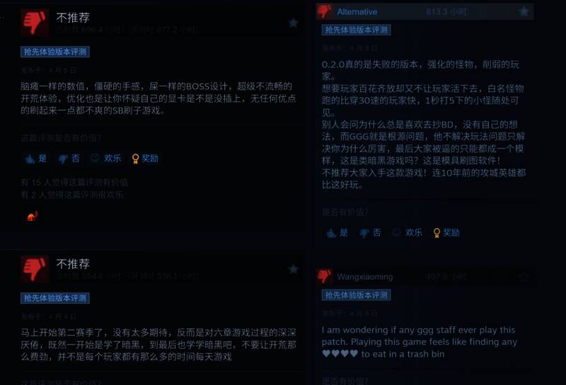 Steam上一名游玩时长超过800小时的用户评论道:“0.2.0真的是失败的版本,强化的怪物,削弱的玩家。想要玩家百花齐放却又不让玩家活下去,白名怪物跑的比穿30速的玩家快,1秒打5下的小怪随处可见。