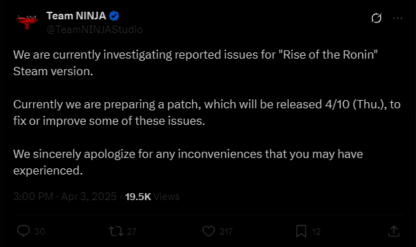 开发团队Team Ninja 现在已正式向粉丝道歉,他们已推特上在发布道歉声明,承认《浪人崛起》Steam 版本中问题众多,准备提供修复补丁来缓和玩家们的怒火,该补丁将于 2025 年 4 月 10 日发布。