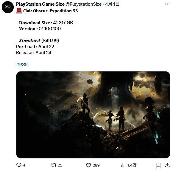 近日,由Sandfall Interactive开发、Kepler Interactive发行的回合制RPG《光与影:33号远征队》的预载日期和下载大小已公布。数据博主@PlaystationSize在X上透露了本作在PS5平台的容量大小和预载日期,一起来看看吧。